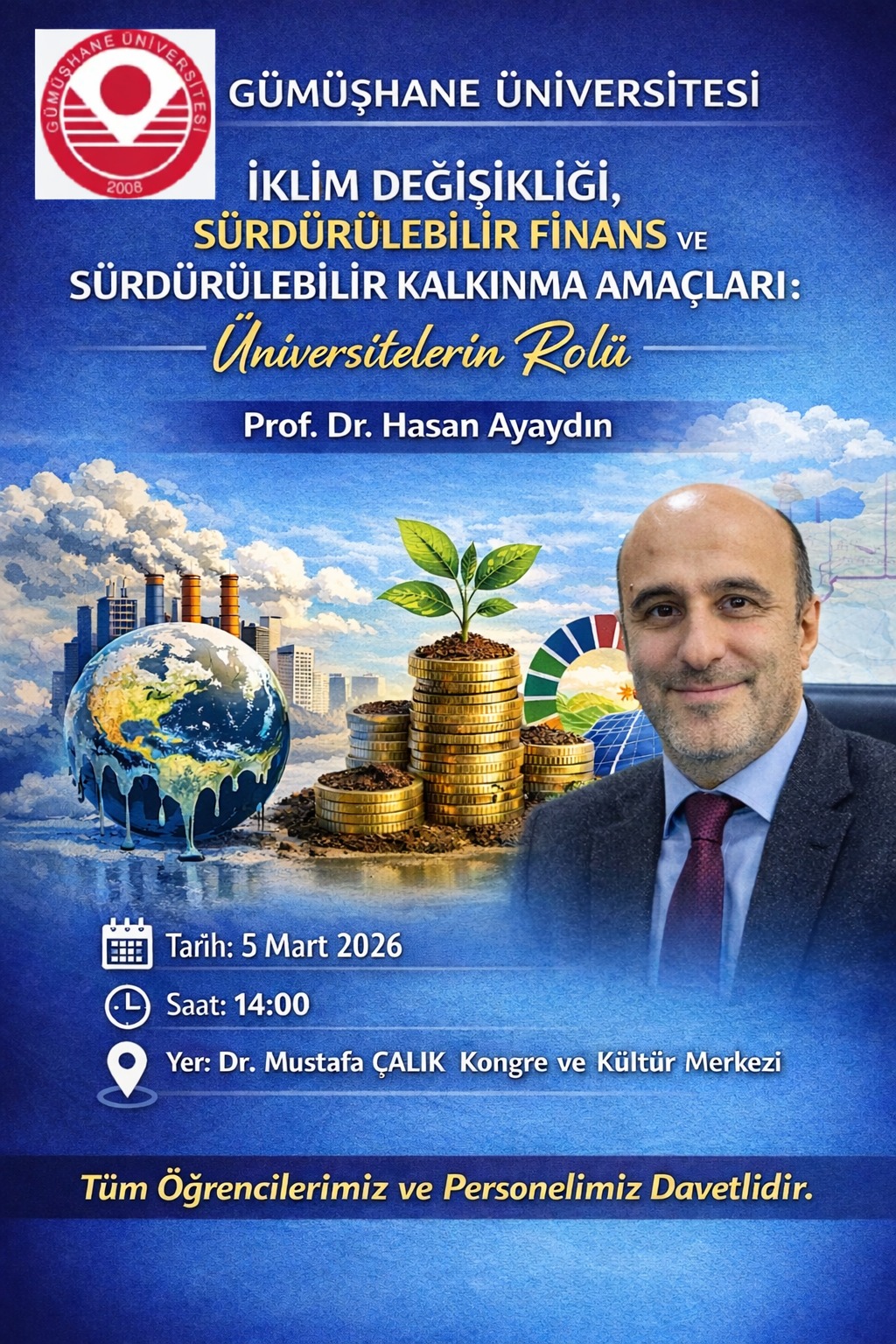 Fakültemiz İşletme Bölümü öğretim üyesi Prof. Dr. Hasan Ayaydın tarafından “İklim Değişikliği, Sürdürülebilir Finans ve Sürdürülebilir Kalkınma Amaçları: Üniversitelerin Rolü” başlıklı seminer düzenlenecektir.