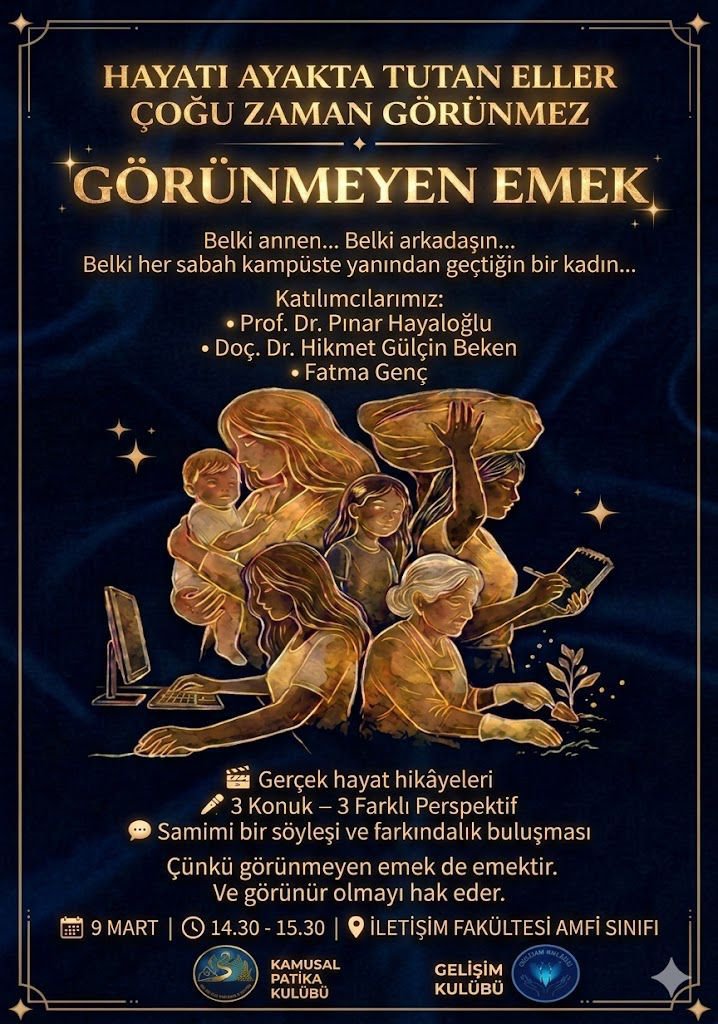 Fakültemiz bünyesinde faaliyet gösteren Kamusal Politika Kulübü ve Gelişim Kulübü tarafından, 8 Mart Dünya Kadınlar Günü kapsamında “Görünmeyen Emek” başlıklı bir etkinlik düzenlenecektir. Etkinlikte, kadınların sosyal ve çalışma hayatında karşılaştıkları zorluklar, bu süreçte ürettikleri değer, dayanışma ve dönüşüm deneyimleri gerçek hayat örnekleri üzerinden ele alınacaktır.