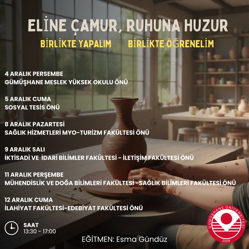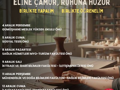 Üniversitemizin farklı birimlerinde 4–12 Aralık tarihleri arasında gerçekleştirilecek etkinliğin ev sahipliğini 9 Aralık Salı günü İİBF ve İletişim Fakültesi üstlenecektir. Öğrenciler, saat 13.30–17.00 arasında seramik eğitmeni Esma Gündüz eşliğinde temel şekillendirme tekniklerini deneyimleyerek hem keyifli zaman geçirirken hem de el becerilerini geliştirme fırsatı bulacaklar.