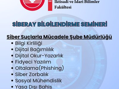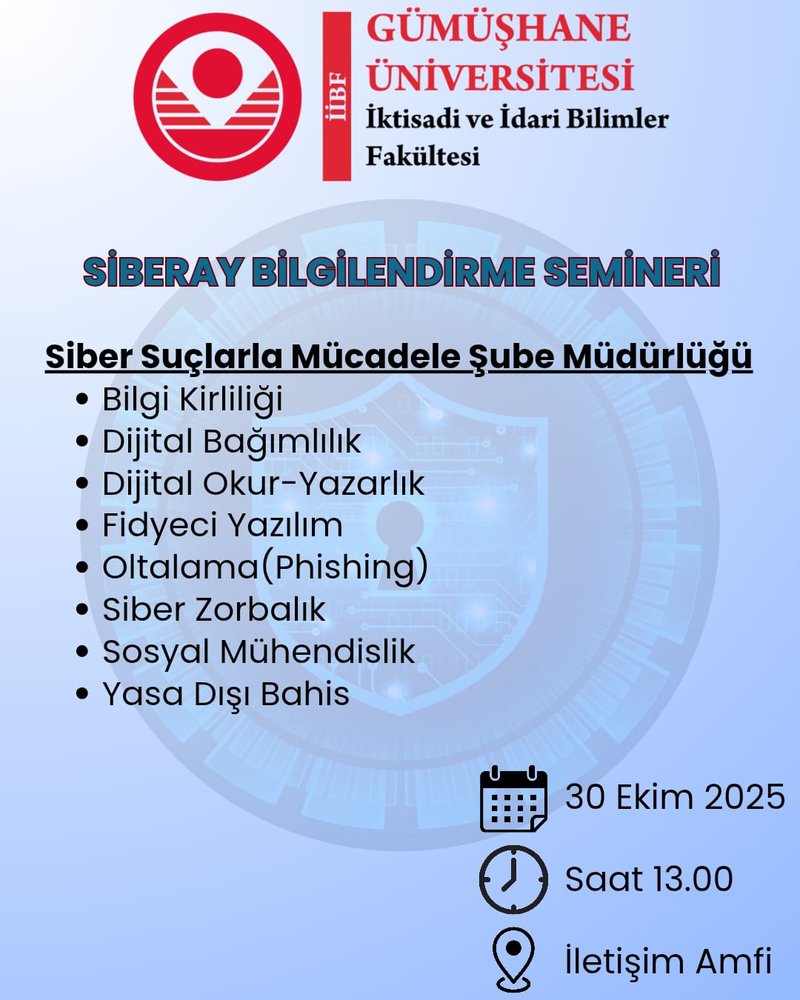 Gümüşhane Üniversitesi İktisadi ve İdari Bilimler Fakültesi tarafından düzenlenen ve Siber Suçlarla Mücadele Şube Müdürlüğü tarafından gerçekleştirilecek olan SİBERAY Bilgilendirme Semineri’ne davetlisiniz.