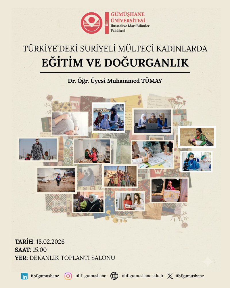 Seminer, Dr. Öğr. Üyesi Muhammed Tümay tarafından 18 Şubat 2026 tarihinde saat 15.00’te Dekanlık Toplantı Salonunda gerçekleştirilecektir. Etkinlikte; Suriyeli mülteci kadınların eğitim olanakları, doğurganlığı etkileyen faktörler ve bu konuların toplumsal hayata olan etkileri ele alınacaktır.